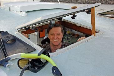 Don Wiebe peeks out the cabin (that's where the food is!)