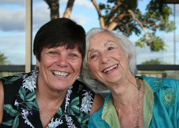 Cheryl Genet and Barbara Marx Hubbard get their heads together over breakfast on the Makaha lanai
